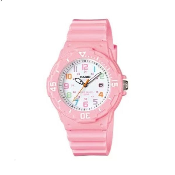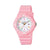 Simple and compact, these dive inspired ladies 3-hand analog timepieces feature 100M water resistance, a bi-directional rotating bezel and date display. Gloss white resin band analog watch with blue accented face.