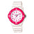 Simple and compact, these dive inspired ladies 3-hand analog timepieces feature 100M water resistance, a bi-directional rotating bezel and date display. Gloss white resin band analog watch with blue accented face.