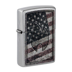Old Glory appears behind the classic Zippo flame icon on this Street Chrome™ lighter. The Color Image design appears well-worn at first glance with its patina effect.Old Glory appears behind...