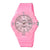 Simple and compact, these dive inspired ladies 3-hand analog timepieces feature 100M water resistance, a bi-directional rotating bezel and date display. Gloss white resin band analog watch with blue accented face.